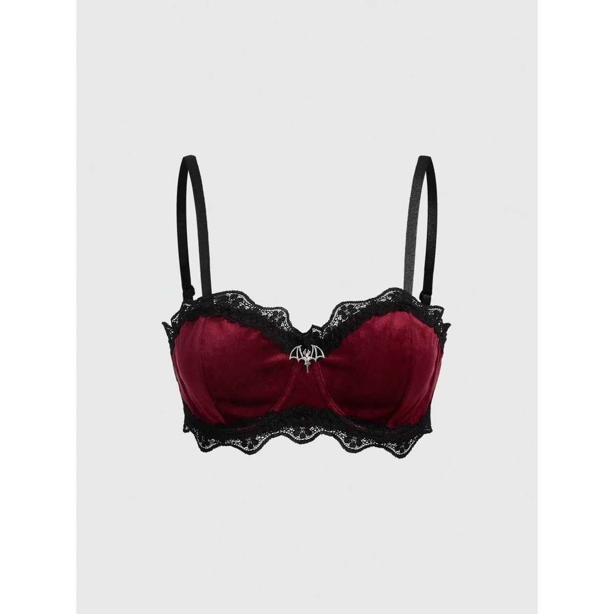 Turn up the dark romance with this stunning gothic-style bra featuring a luxurious deep purple velvet fabric trimmed in delicate black lace. A silver-tone bat charm detail at the center adds a bold, edgy finish ? perfect for Halloween, alt fashion, or everyday wear with a unique twist.