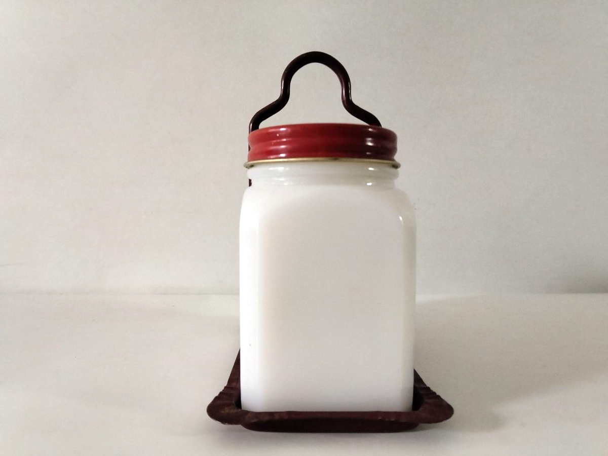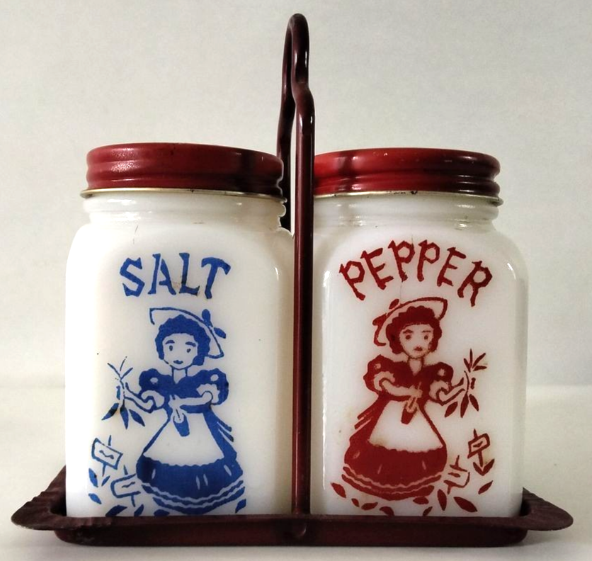 Vintage McKee Tipp City Milk Glass Salt & Pepper Shakers + Holder - Garden Girl