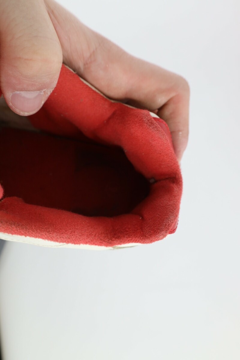Unwearable. Display only. Has cracking in leather on toes, right shoe side, and left shoe heel and yellowing and stains on sides and laces. Has distressing on left shoe insole. Will need to most likely be reglued.