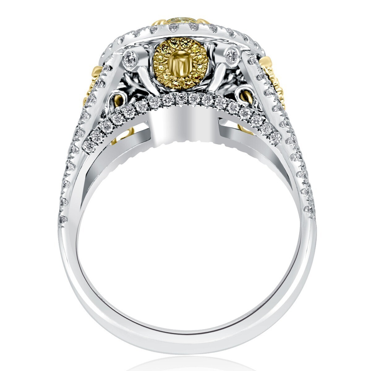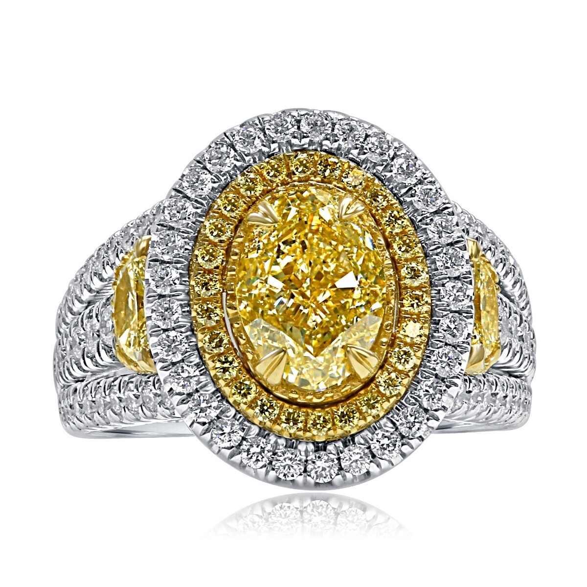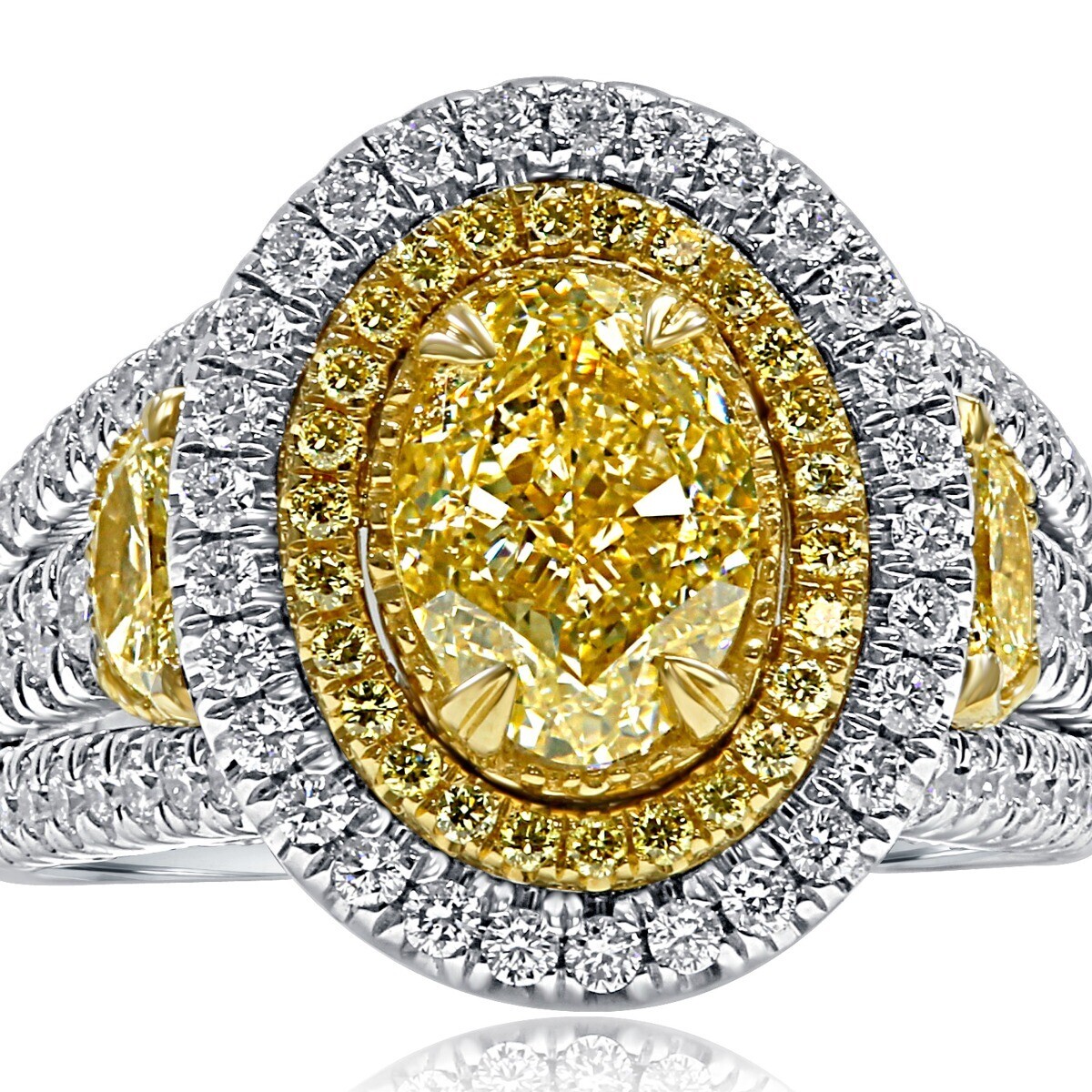 Aucune bague n'attirera autant d'attention que ce cierge magique ! Cette bague de fiancailles spectaculaire met en valeur un diamant jaune clair central de taille brillant modifie ovale certifie GIA de 1,51 carat entoure de deux diamants jaunes pales de taille demi-lune sur le cote. Le double halo de diamants ronds incolores et jaunes scintillants encadre elegamment le diamant central, creant un look eblouissant. Fabrique a la main en or 18 tons multicolores. Le poids total en carats est de 3,32 carats.