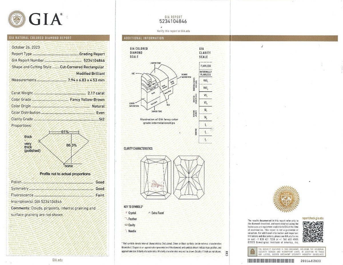Es una manera perfecta de decir, te amo, ¡con este hermoso anillo de diamantes! Este anillo de compromiso de diseño Art Deco muestra un certificado de gia de 2.17 quilates, corte radiante de diamante de diamante de color marron amarillo natural, abrazado por dos lados de diamantes de billon de billones incolores. Los diamantes color redondo y amarillo de corte redondo adicional bordean el halo doble y el vastago dividido agregando una elegancia adicional al anillo. Hecho a mano en oro múltiple de 14 quilates. El peso total de quilates es de 3.78 quilates. Todos nuestros productos estan hechos a mano con calidad y cuidado, en el corazon del Distrito de Diamantes en la calle 47 en la ciudad de Nueva York. Nuestra dedicacion y compromiso con el buen trabajo y la calidad excede a todos los dem
