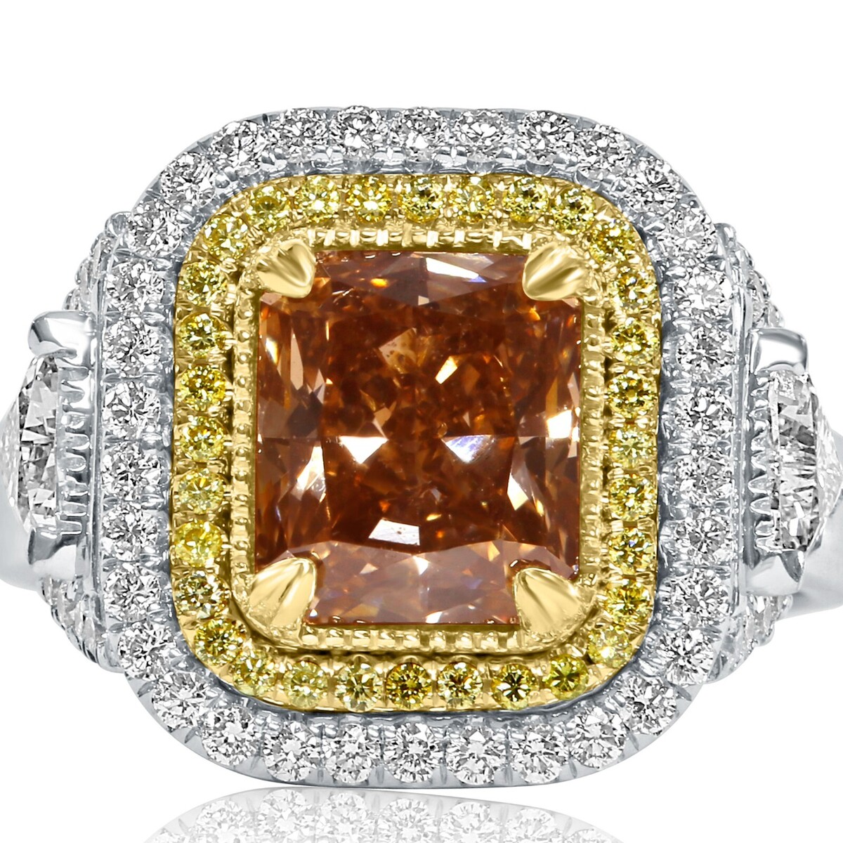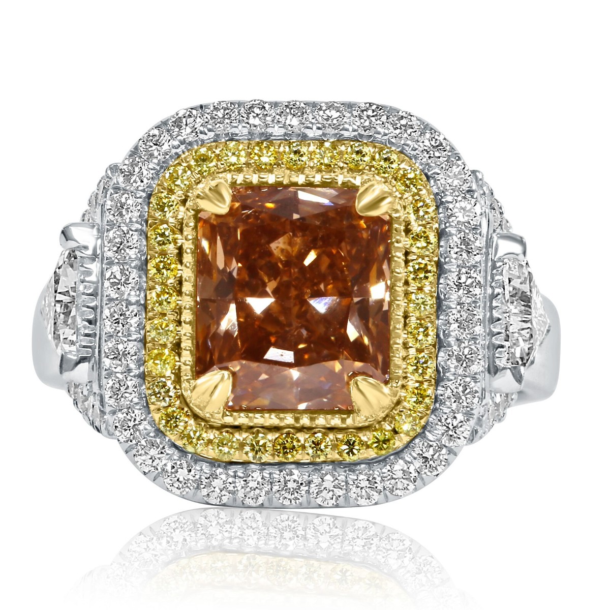 GIA 3.78 TCW Natural fantasía amarillo marron radiante anillo de diamante de 14k oro blanco