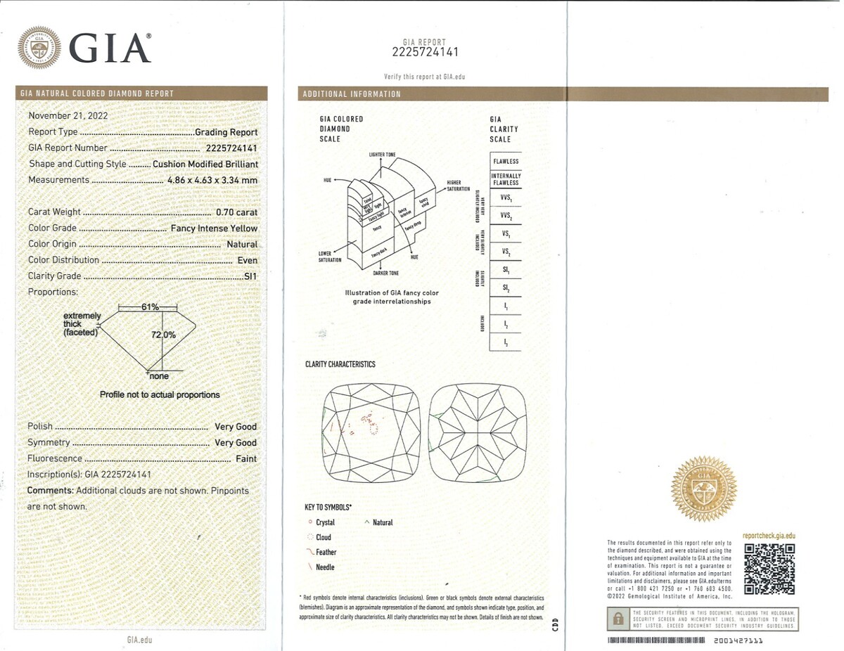GIA Certificato 1.78 TCW Cuscino Decorato Intensi Giallo Anello Diamante 18k