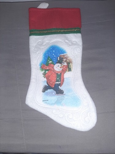 Vintage Santa's Best Christmas Stocking Embossed Felt Snowman Skating White 15"
