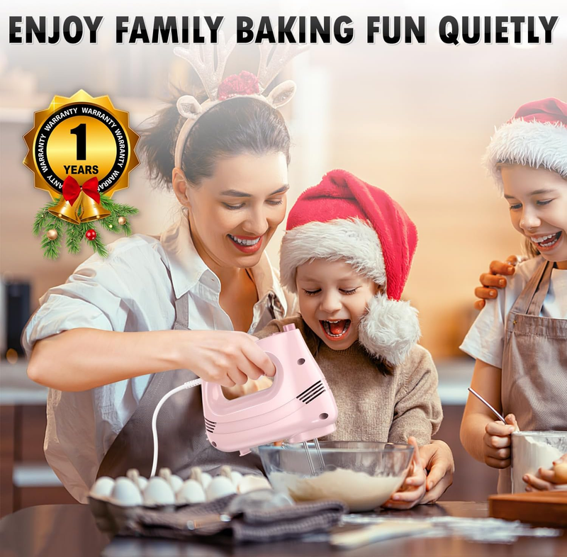 Electric Hand Mixer with Stainless Steel Whisk, Dough Hook Attachment and Storage Bag, Handheld Mixer for Baking Cakes, Eggs, Cream Food Mixers. Turbo Boost /5 Speed Kitchen Blender PINK