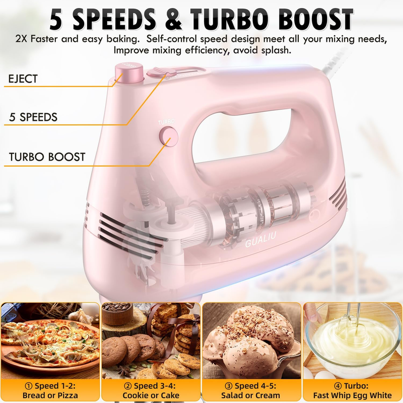 ??????? ????? ????-??????? ??????: GUALIU hand mixer features a 5-speed self-controlled speed and an additional turbocharging feature that allows you to choose the best mixing speed for any recipe. Suitable for whipped cream, butter, egg whites and batter, as well as mashed potatoes and other dishes!