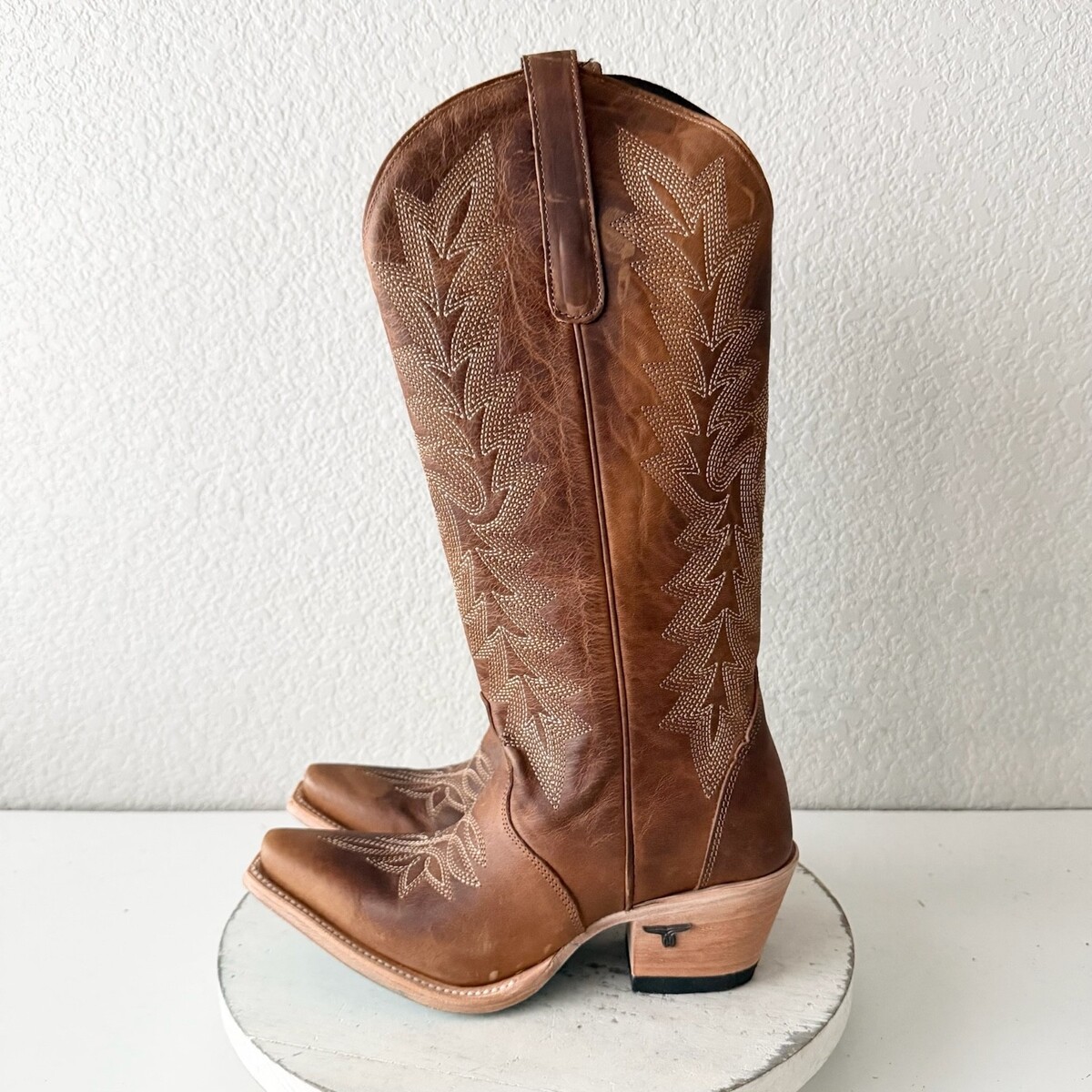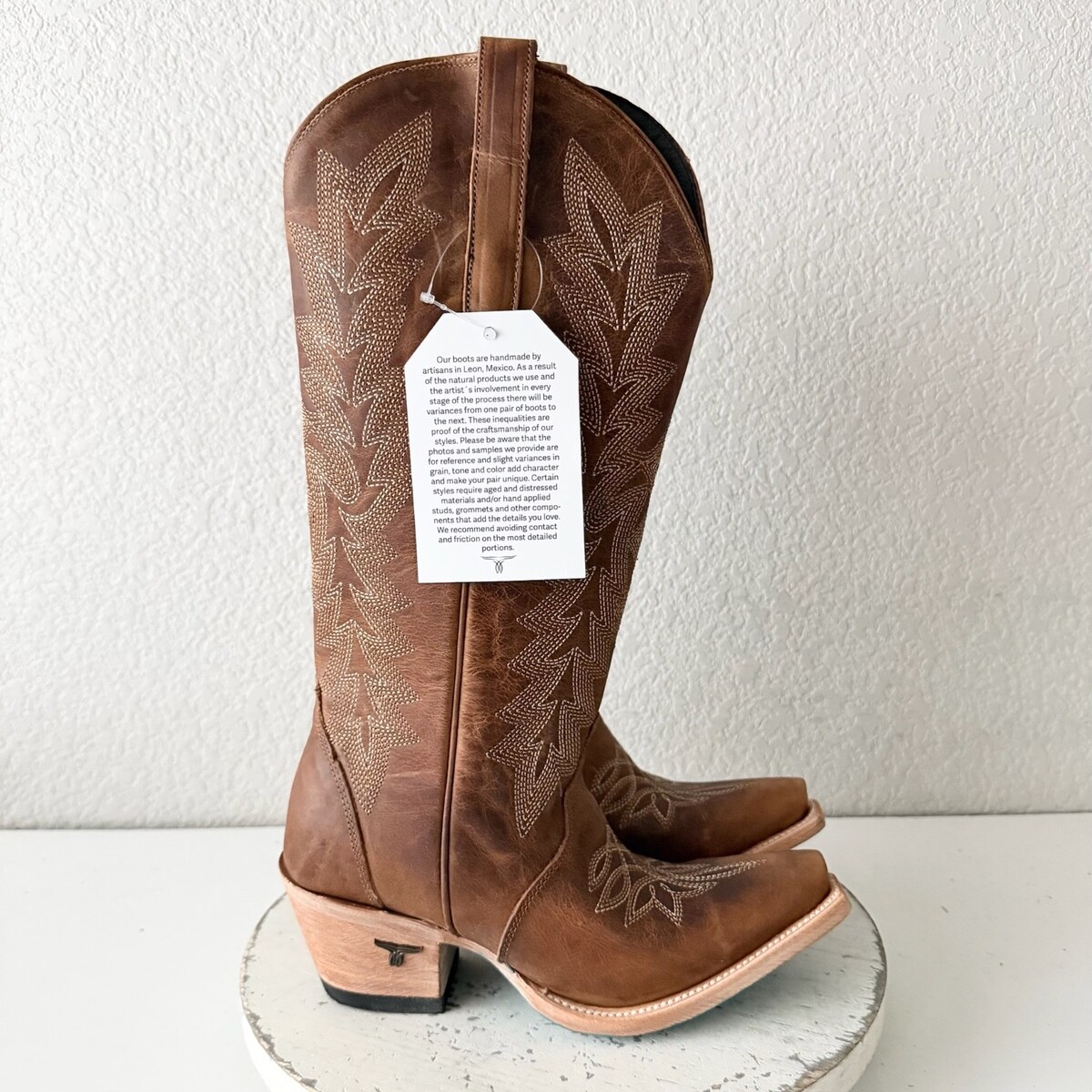 Lane GALLATIN Womens Cowboy Boots in Desert Clay Brown Leather with a tall 14" Mid Calf shaft and Western Pointed Snip Toe