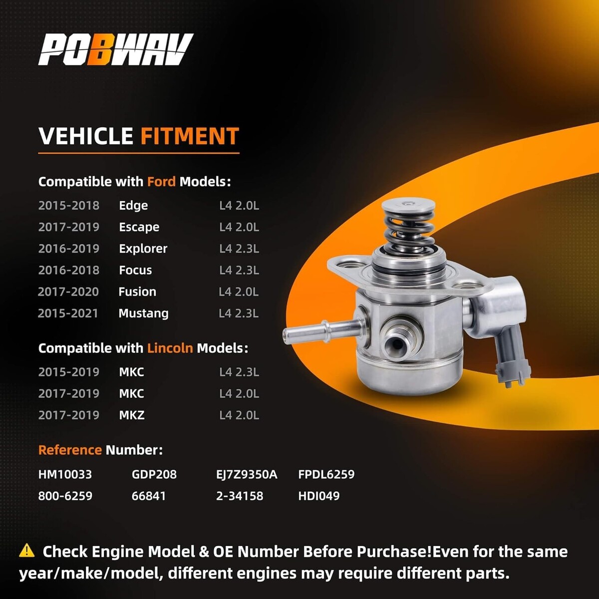 HM10033 fuel pump, GDP208 replacement, EJ7Z9350A high pressure fuel pump, Ford Edge fuel pump, Ford Escape fuel pump, Ford Explorer fuel pump, Ford Focus fuel pump, Ford Fusion fuel pump, Ford Mustang fuel pump, Lincoln MKC fuel pump, Lincoln MKZ fuel pump, 2.0L fuel pump, 2.3L fuel pump, FPDL6259, 800-6259, 66841, 2-34158, HDI049, POBWAV HM10033, high pressure fuel pump replacement, direct fit fuel pump