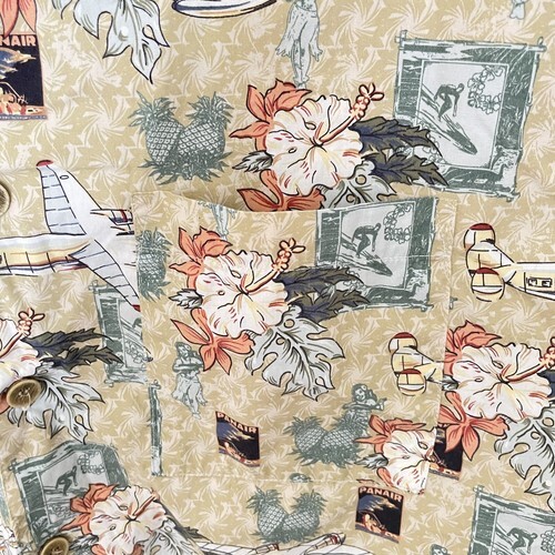 This OP Sport Hawaiian Shirt is perfect for those who loves a good summer vibe. It features a beige linen color with a graphic print of a Panair Bi-Plane, Hula girl, Surfer Dude and Hibiscus flowers.The short-sleeved shirt is made from a 100% cotton material and has a spread collar style with button closure.