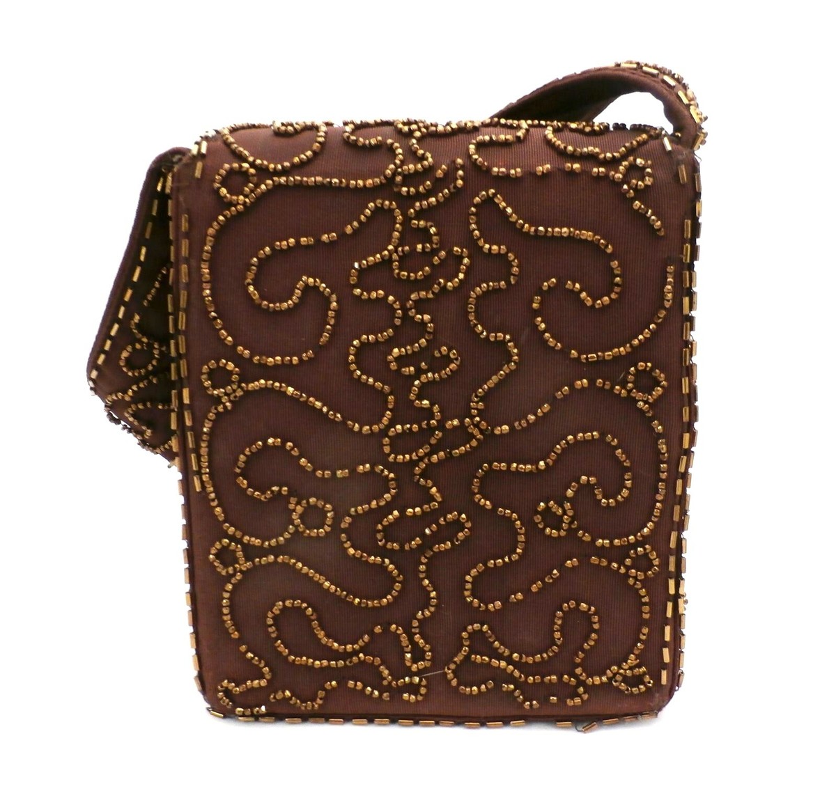 Vintage 1940s chocolate brown faille box style bag- needs a few beads replaced or re-sewn, but otherwise in great condition. The vintage box style purse with one large compartment and wide strap is lined in brown satin fabric. The vintage bag measures 5 1/4" wide by 6 1/2" tall by 2 3/4" deep. Excellent condition other than a few missing/loose beads..