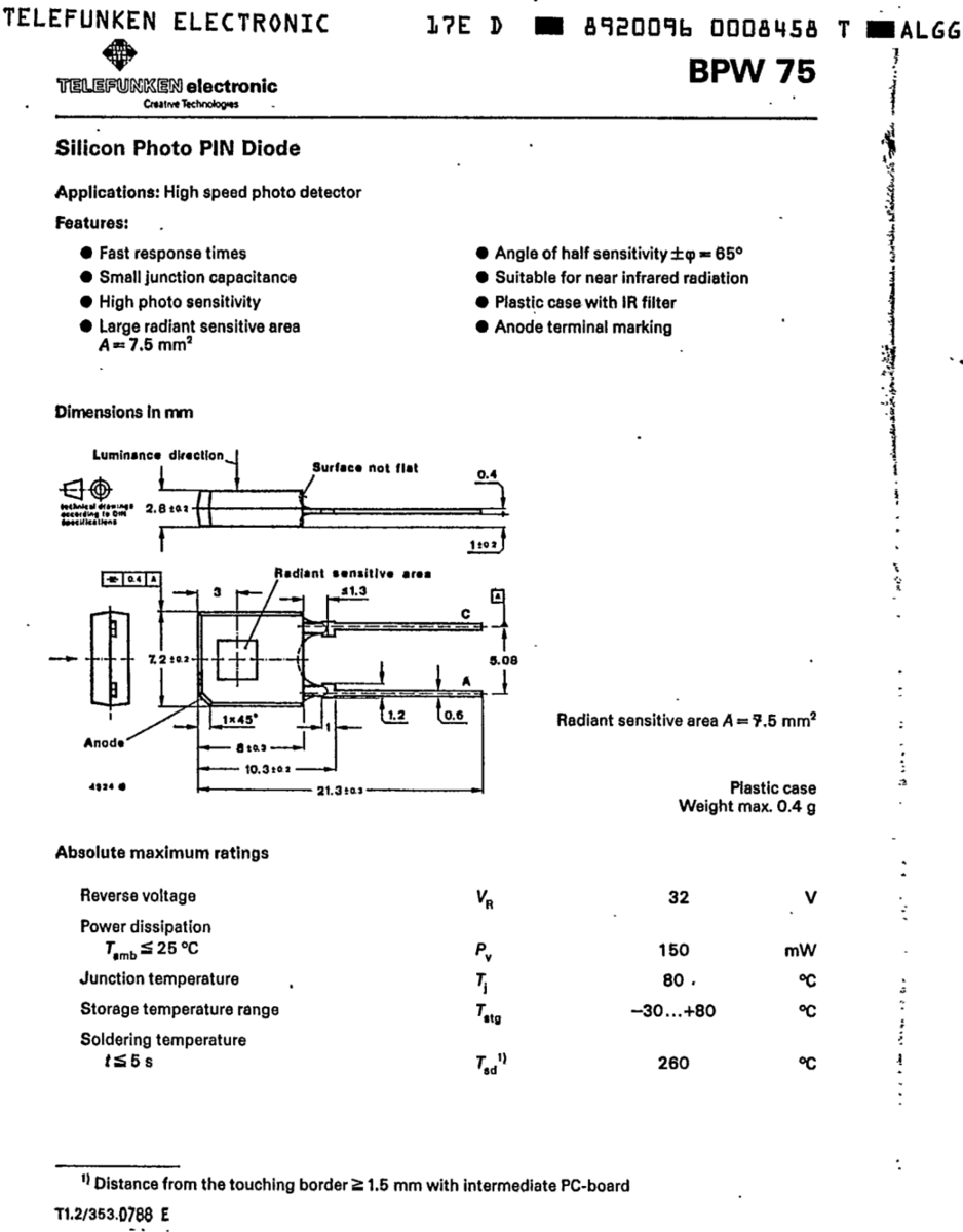 2 Pieces - BPW75 TFK Silicon Photo PIN Diode 32V 150mW