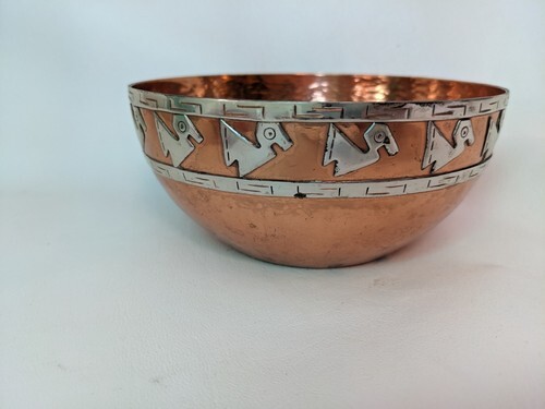 In vendita e una ciotola per uccelli Maya in argento sterling 925 Vicky Industria Perù Rame usata 5,5 x 2,5 pollici.