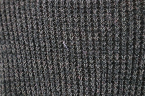 Fabric pulls, pilling. Shoulders stretched. Collar, cuffs discolored. Color faded. Oversized baggy fit