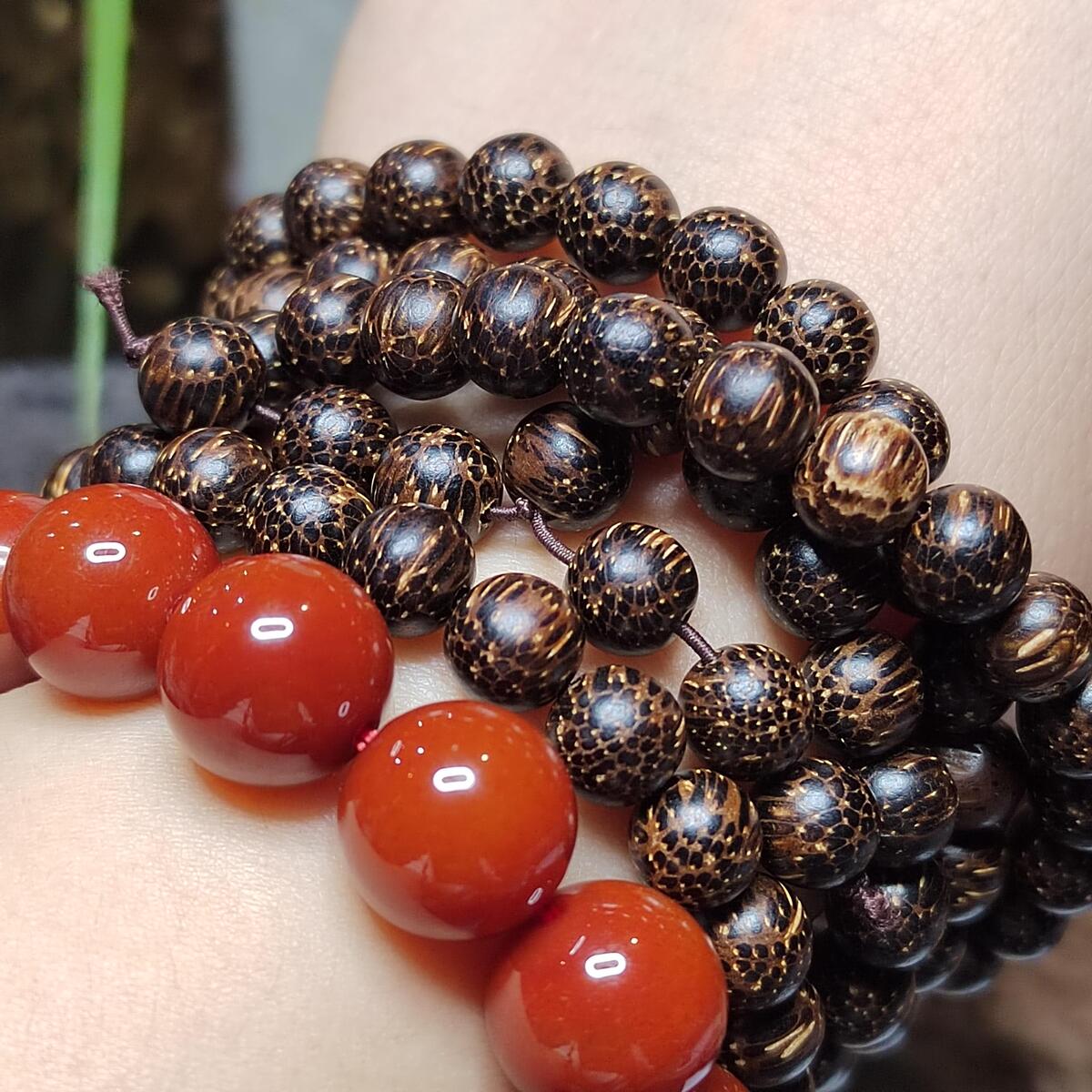 Discover the calming elegance of this Cultivated Hainan Golden Star Agarwood Mala Bracelet—crafted from resin-rich wood aged 10–15 years and sourced from tropical plantations in Hainan, China. Each of the 108 smooth round beads is hand-polished to reveal the rare golden star grain (???), a shimmering pattern formed deep within the heartwood. This bracelet blends tradition, craftsmanship, and spiritual energy—ideal for meditation, gifting, or everyday wear.