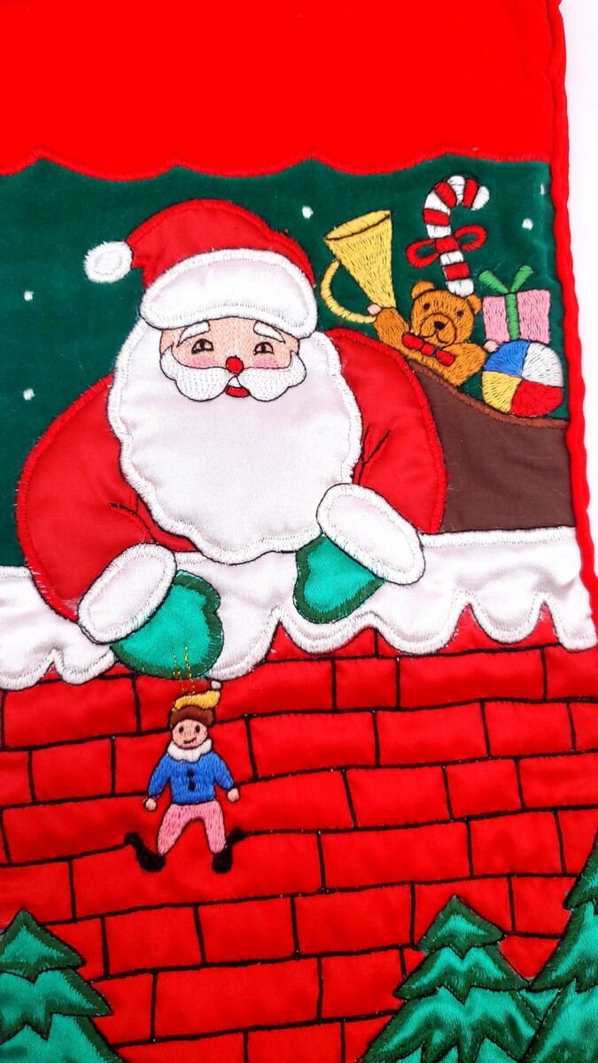 Vintage Embroidered Christmas Stocking Santa Clause Roof Red & Green Holiday