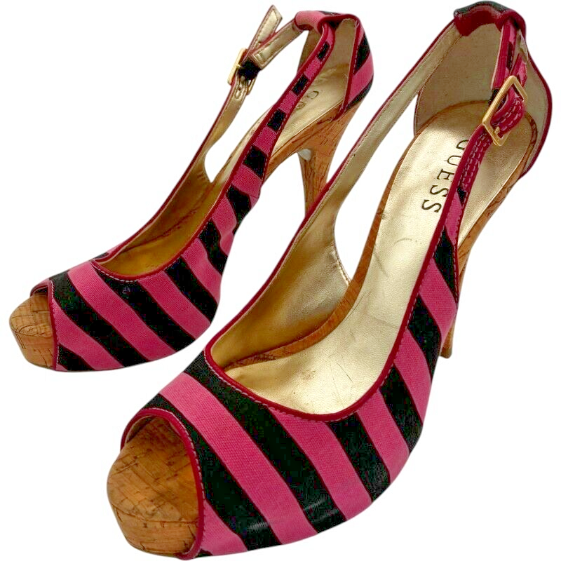 guess hondola women's pink/black stripe peep toe platform cork heels size 8 M
