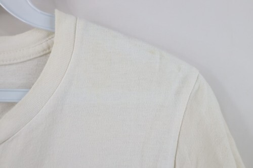 Collar, arms discolored. Yellowed. Graphics faded. Pilling. Loose threads left arm