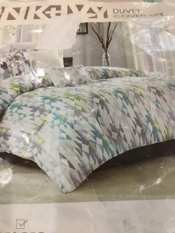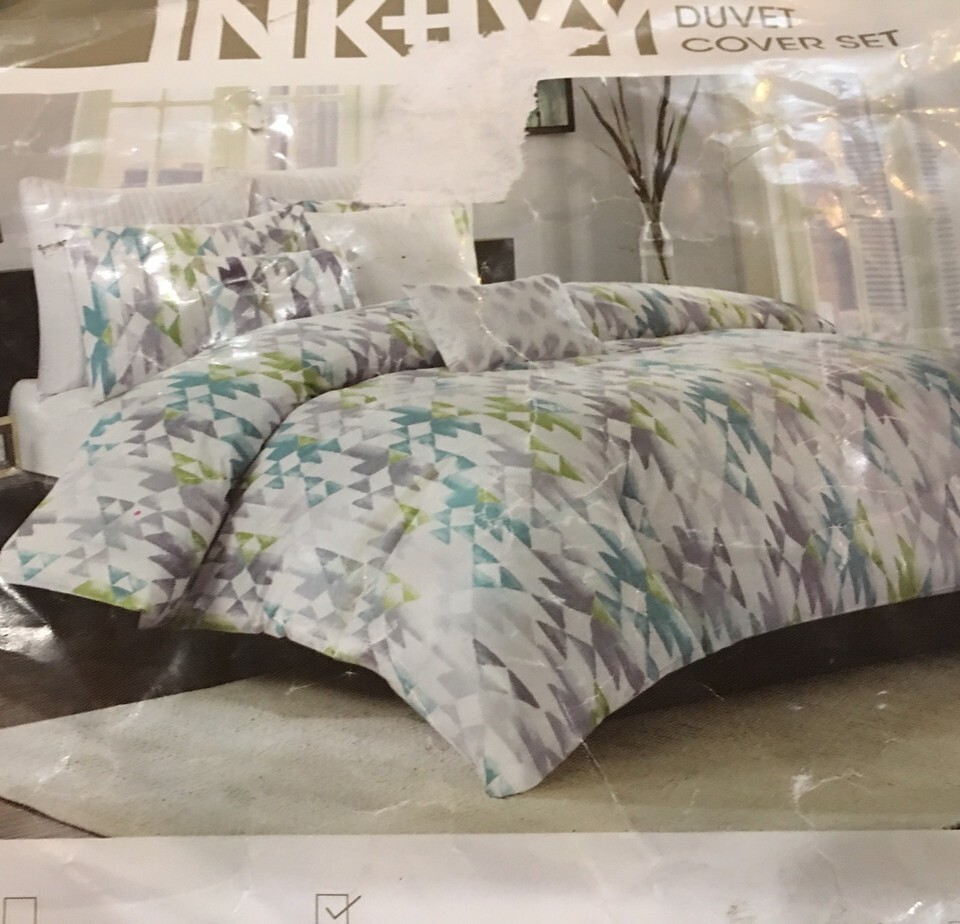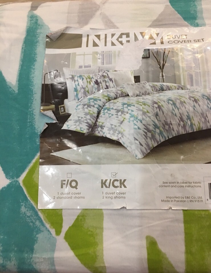 INK+IVY 3PC KING DUVET SET "SIERRA" IKAT WHITE/LIME/GREY/AQUA Reversible NIP