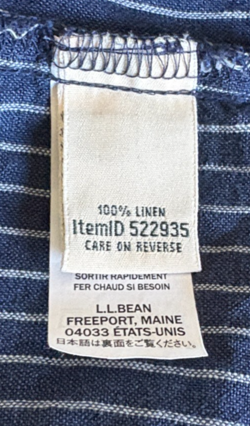 L.L. Bean Women's Navy Pinstripe Blouse Size L. Chic navy blouse with pinstripe design. Features a relaxed fit and V-neckline. Ideal for versatile styling. 100% Linen and Machine Washable. Armpit to armpit measures 23?. Shoulder to hem is 24? in the front and 27? in the back. Sleeves measure 18? from the top of the shoulder seam to bottom of the cuff. Very Good Used Condition - See Photos for further description.
