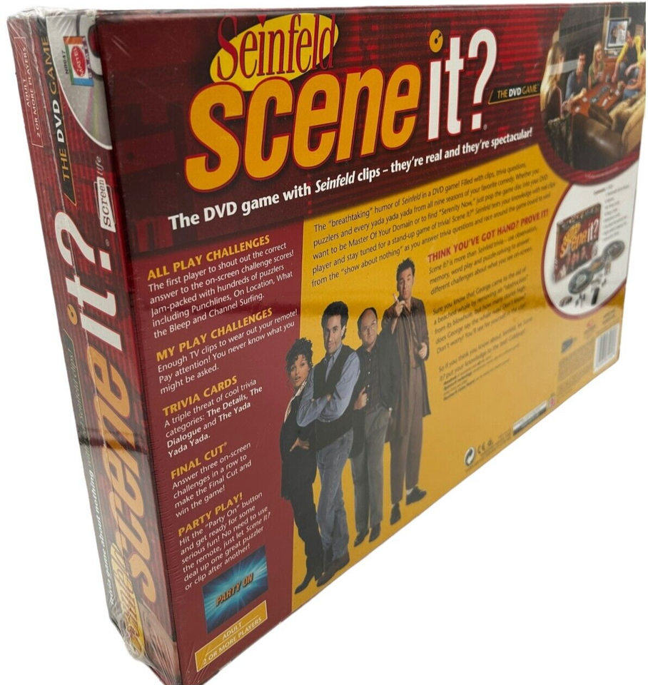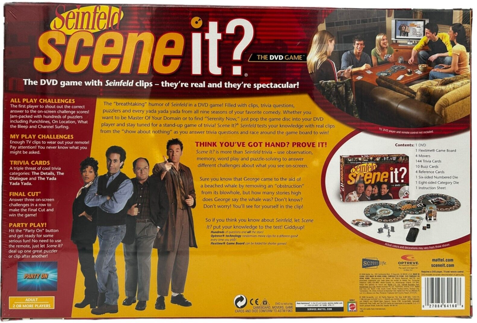Experience the humor of Seinfeld in this DVD game that's filled with clips, trivia questions, puzzlers and every yada yada yada from nine seasons of your favorite comedy. Whether you want to be master of your domain or to find serenity now, just pop the game disc into your DVD player and stay tuned for a stand-up game of trivia and fun. Scene It? Seinfeld Edition tests your knowledge with real clips from the ""show about nothing"" as you answer trivia questions and race around the game board to win. Optreve Technology randomizes clips for a different game every time you play.