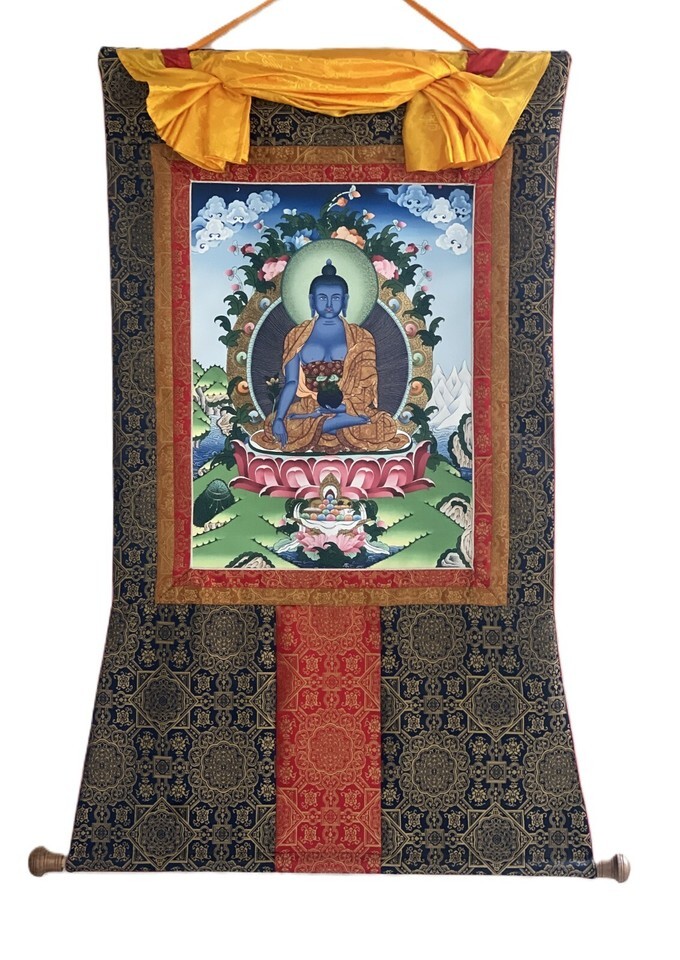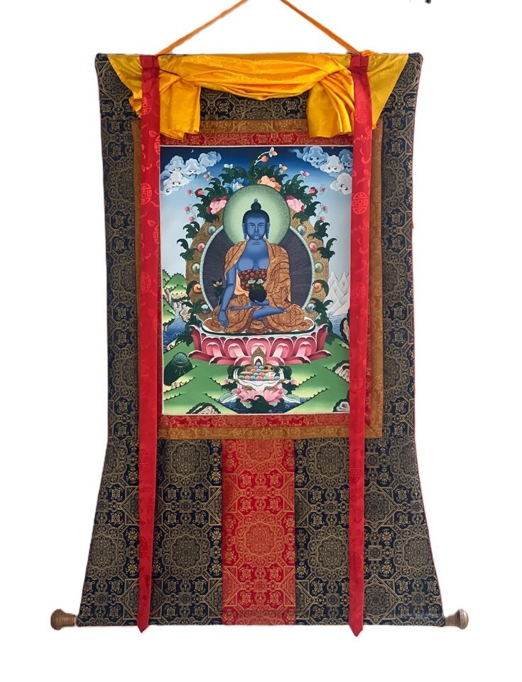 MEDICINE BUDDHA DIGITAL GICLEE TIBETAN THANGKA PRINT WITH PREMIUM SILK BROCADE