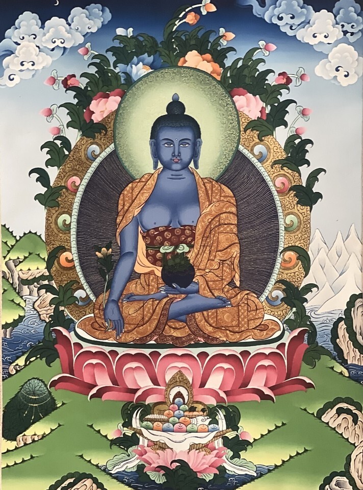 The Thangka features Medicine Buddha (Bhaisajyaguru), the supreme healer in Tibetan Buddhism, revered for his ability to dispel ailments, both physical and spiritual. With his deep blue lapis-lazuli body, he symbolizes the ultimate wisdom of healing and compassion. This print captures the sacred essence of the traditional hand-painted Thangka, making it an ideal piece for meditation, spiritual practice, or as a meaningful addition to any sacred space.