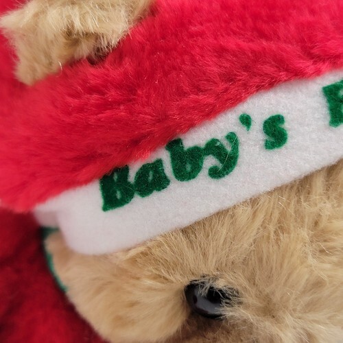 Vintage Enesco 1983 Plush Baby's First Christmas Sitting Teddy Bear Zip Pajamas. Images show actual item that will ship.
