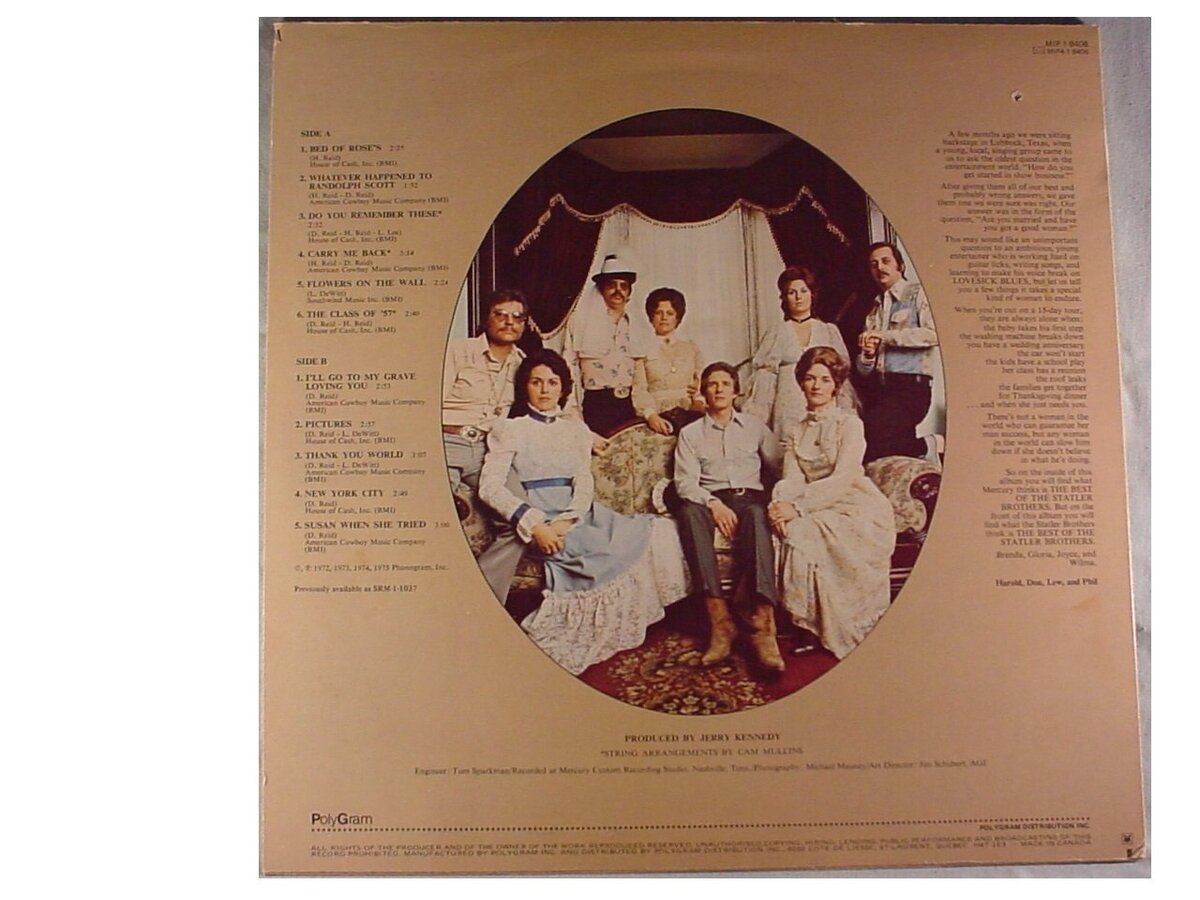 Product description: Side One Bed Of Roses?s 2:25 Whatever Happened To Randolph Scott 1:52 Do You Remember These 2:52 Carry Me Back 3:14 Flowers On The Wall 2:24 The Class of ?57 2:40 Side Two I?ll Go To My Grave Loving You 2:53 Pictures 2:57 Thank You World 3:07 New York City 2:49 Susan When She Tried 3:00