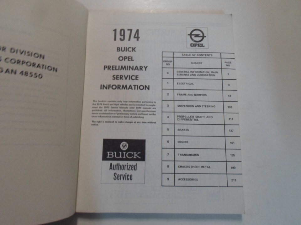 1974 Buick Opel Preliminaire Service Information Manuel Endommage Worn Usine OEM