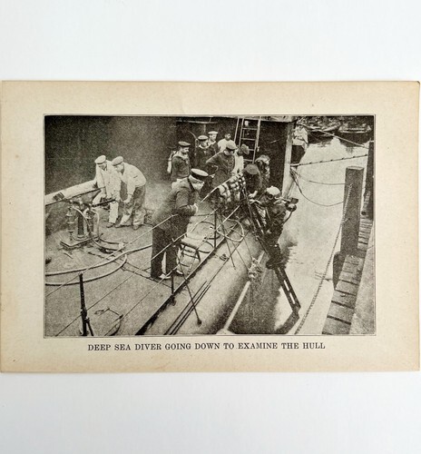 1914 WW1 Print Deep Sea Diver Examines Battleship Navy Ship Antique Military