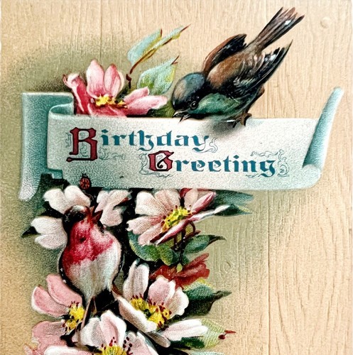 Happy Birthday Greeting Postcard 1910s Pink Flowers Birds Embossed German PCBG3D