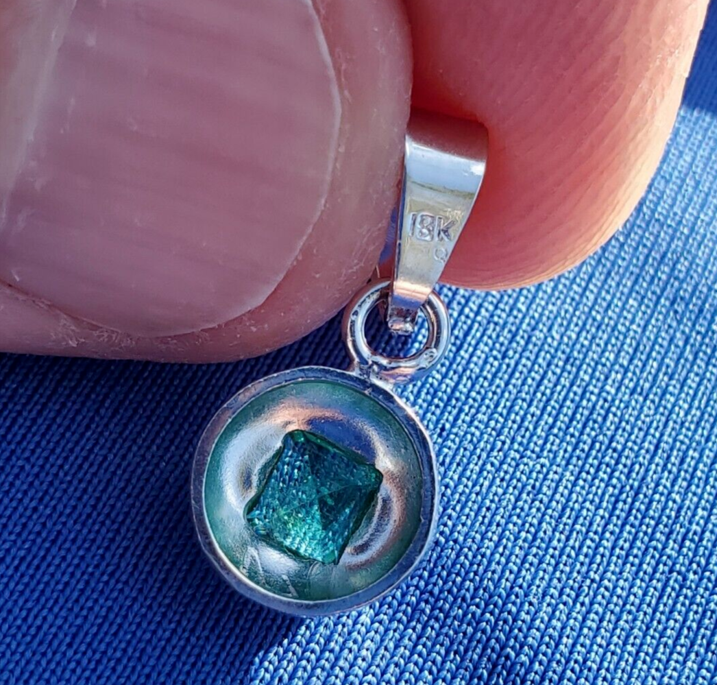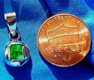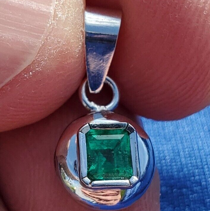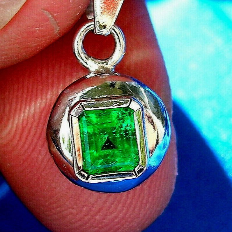 Earth mined Colombian Emerald Deco style Bezel Pendant Solitaire 18k White Gold