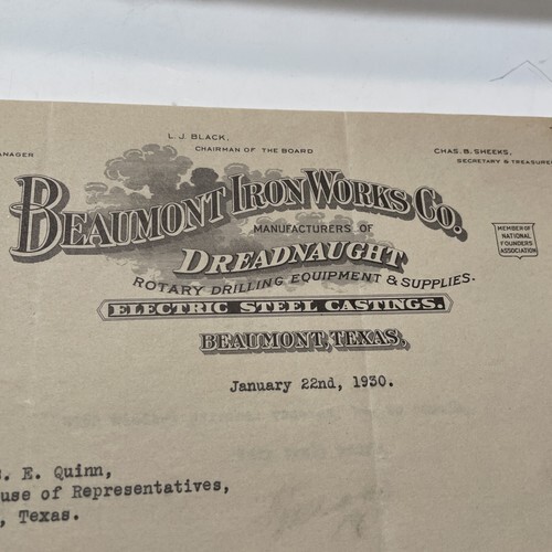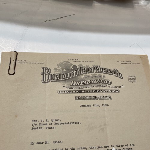 Beaumont Iron Works Drilling Equipment Mfgrs letter 1930 Dreadnaught texas oil h