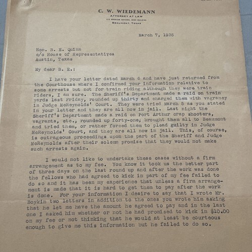 Letter is to B. E. Quinn who was the state representative from the Beaumont area, who apparently asked the attorney to represent men who were arrested for train riding and vagrancy.