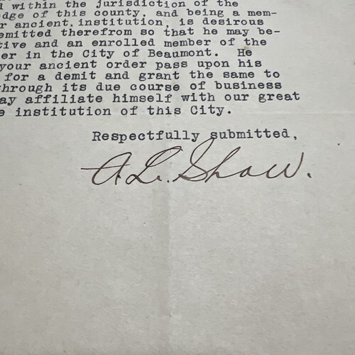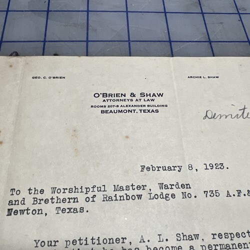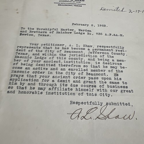 Vintage Letter Beaumont Texas Attorney Archie L Shaw Masonic Demit 1923 AF & AM