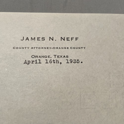 Orange County Texas Attorney James N Neff Letter 1935 Political History