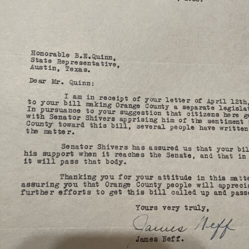 Orange County Texas Attorney James N Neff Letter 1935 Political History.