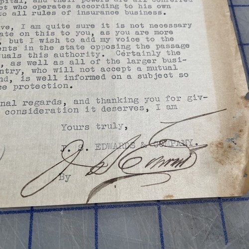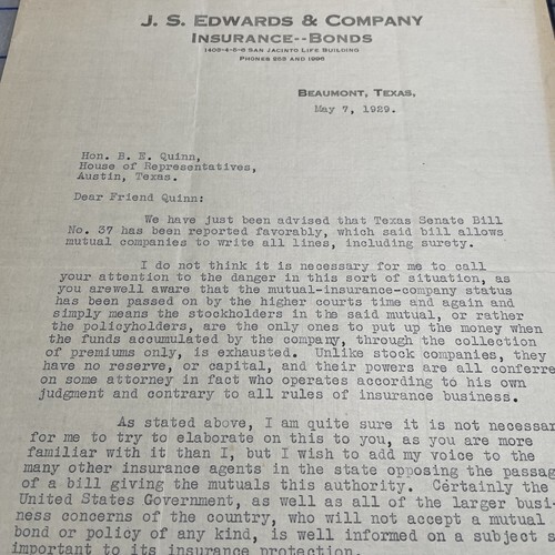 Antique Letter J. S. Edward’s & Company Insurance 1929 Signed Beaumont Texas
