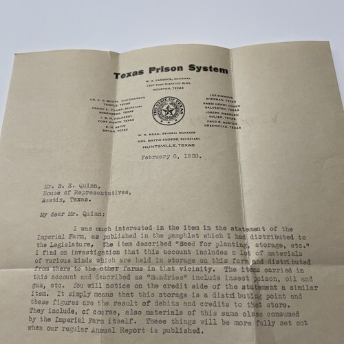 Vintage Letter Texas Prison System To Texas State Rep. B. E. Quinn 1930.
