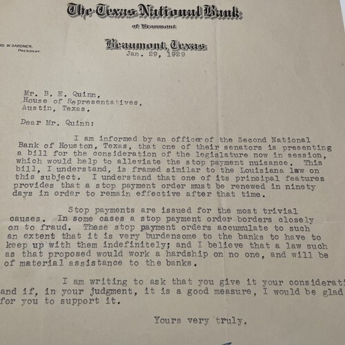 Letter is written to B. E. Quinn who was the state representative from Beaumont at the time