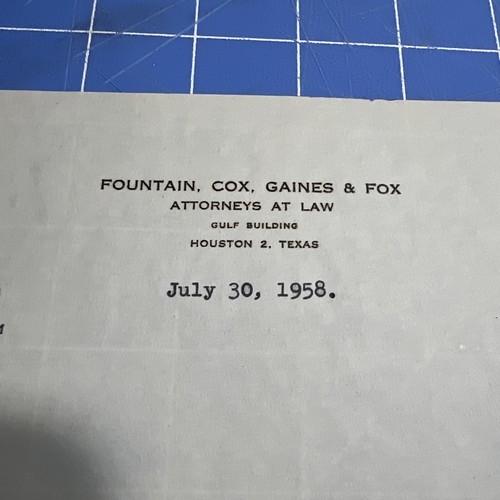 Vtg Letter 1958 Fountain Cox Gains & Fox Houston Texas Signed James A Pekenham