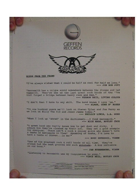 Questo kit di stampa intitolato "Words From the Front" include commenti sull'aerosmith di altre band rock tra cui Jon Bon Jovi, Vernon Reid (colore vivente), Slash, Mick Mars (Motley Crue), Philip Lewis (La Guns), Roxy Petrucci (Vixxen) e molti altri.
