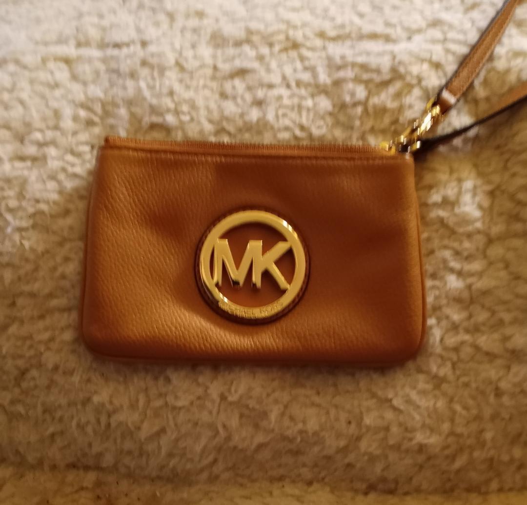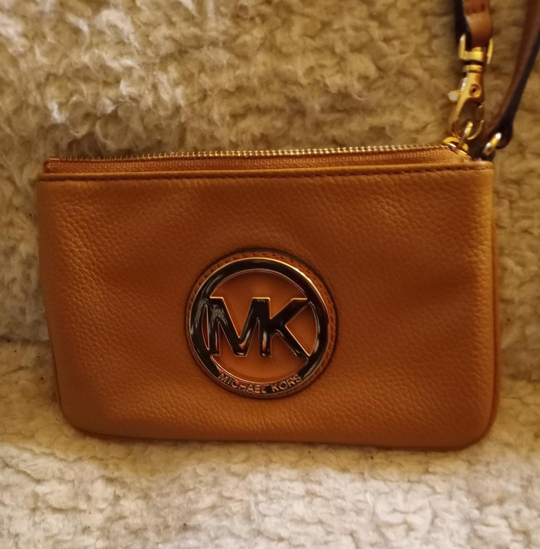 This Michael Kors clutch, crafted in tan leather, features a sleek wrist strap, card slots, zippered closure, and a striking gold logo medallion. Its minimalist design is perfect for carrying essentials, combining sophistication with practicality.