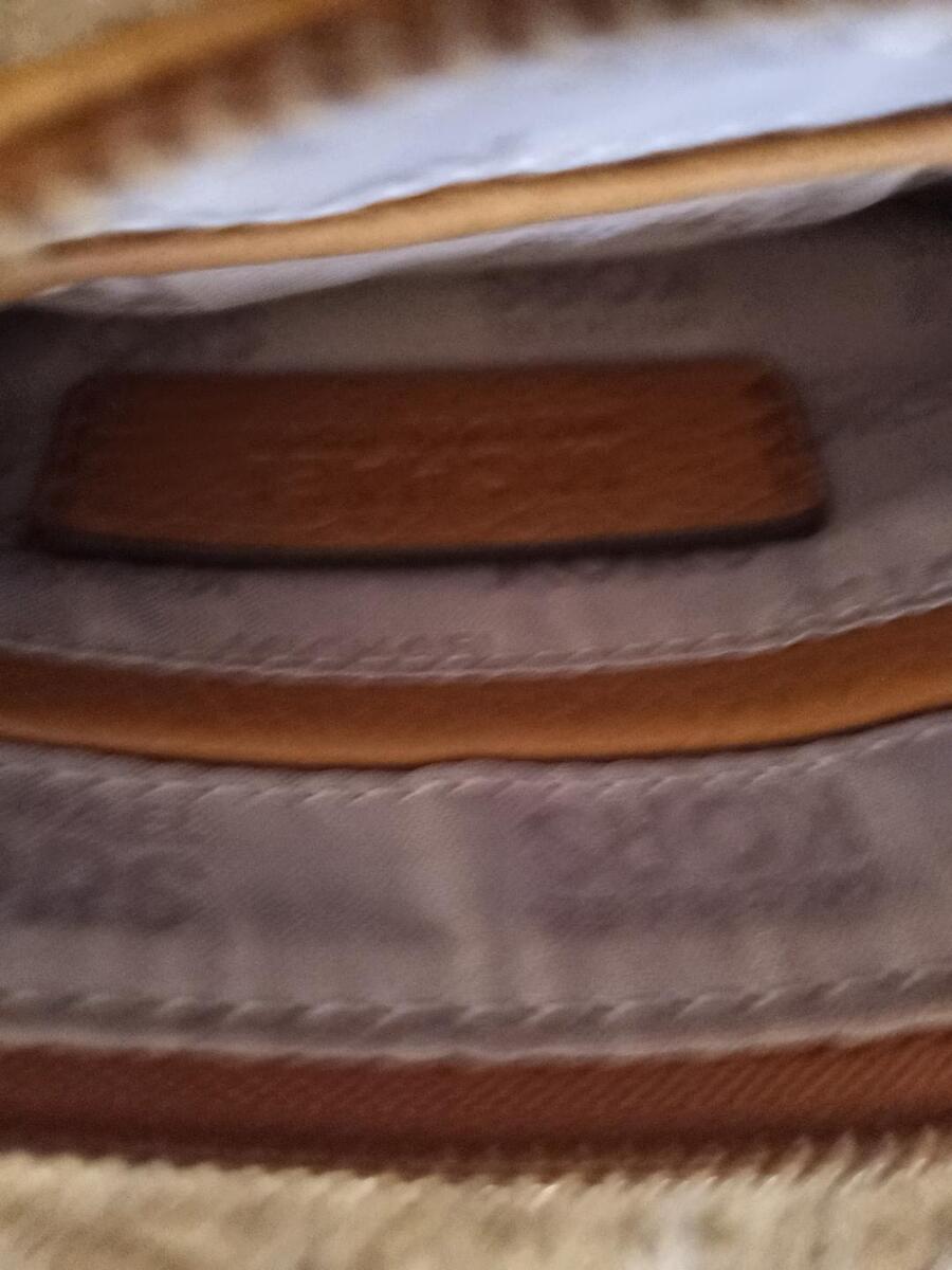 This designer tote bag by Michael Kors is a medium-sized piece perfect for travel and a must-have for any fashion-savvy woman. The bag features a snap closure, double handles made of jacquard material, and an adjustable strap for added comfort. The black and tan canvas and leather exterior is accented with the Michael Kors logo and is complemented by a canvas lining material.