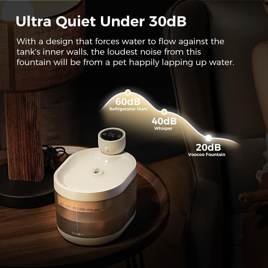 ? Ultra-Quiet Operation ( 30dB) for Peaceful Homes -- Equipped with a noise-reducing pump that operates at less than 30dB, creating a calm drinking environment for pets and a quiet home for light sleepers.