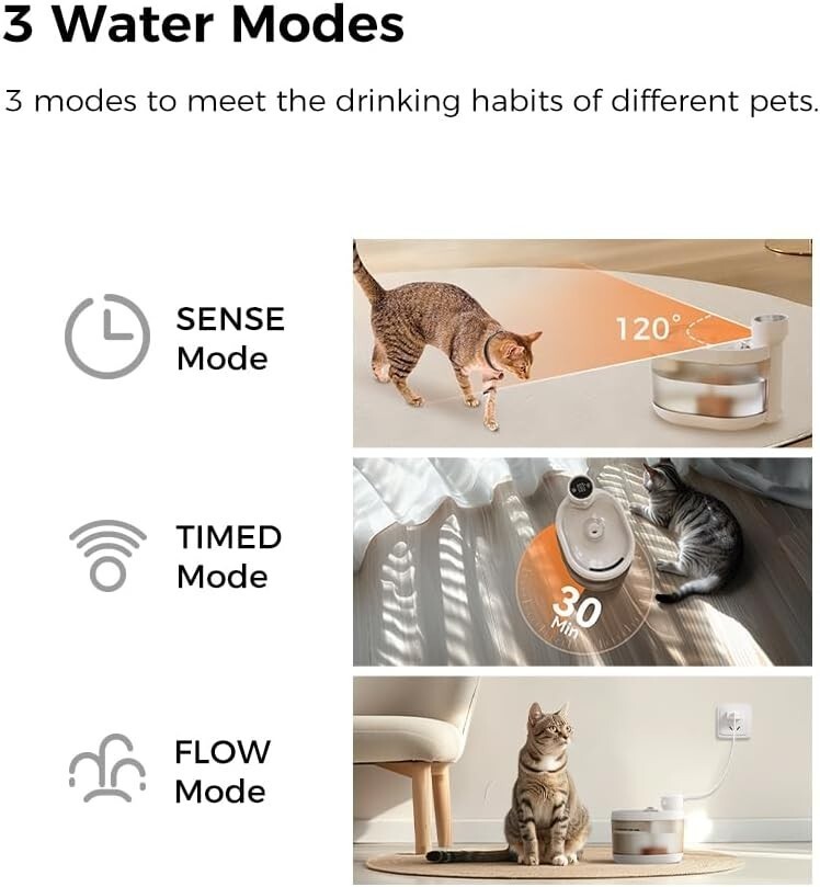 ? Smart 3 Modes for Every Pet?s Needs -- Choose from SENSE (motion-activated), FLOW (continuous), or TIMED (hourly) modes via the LED touch screen. Perfect for encouraging hydration while saving energy.
