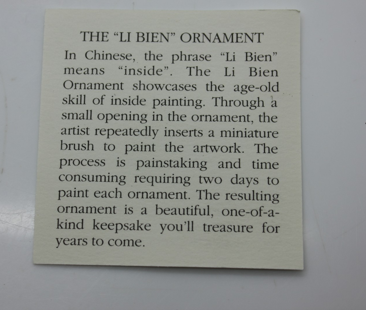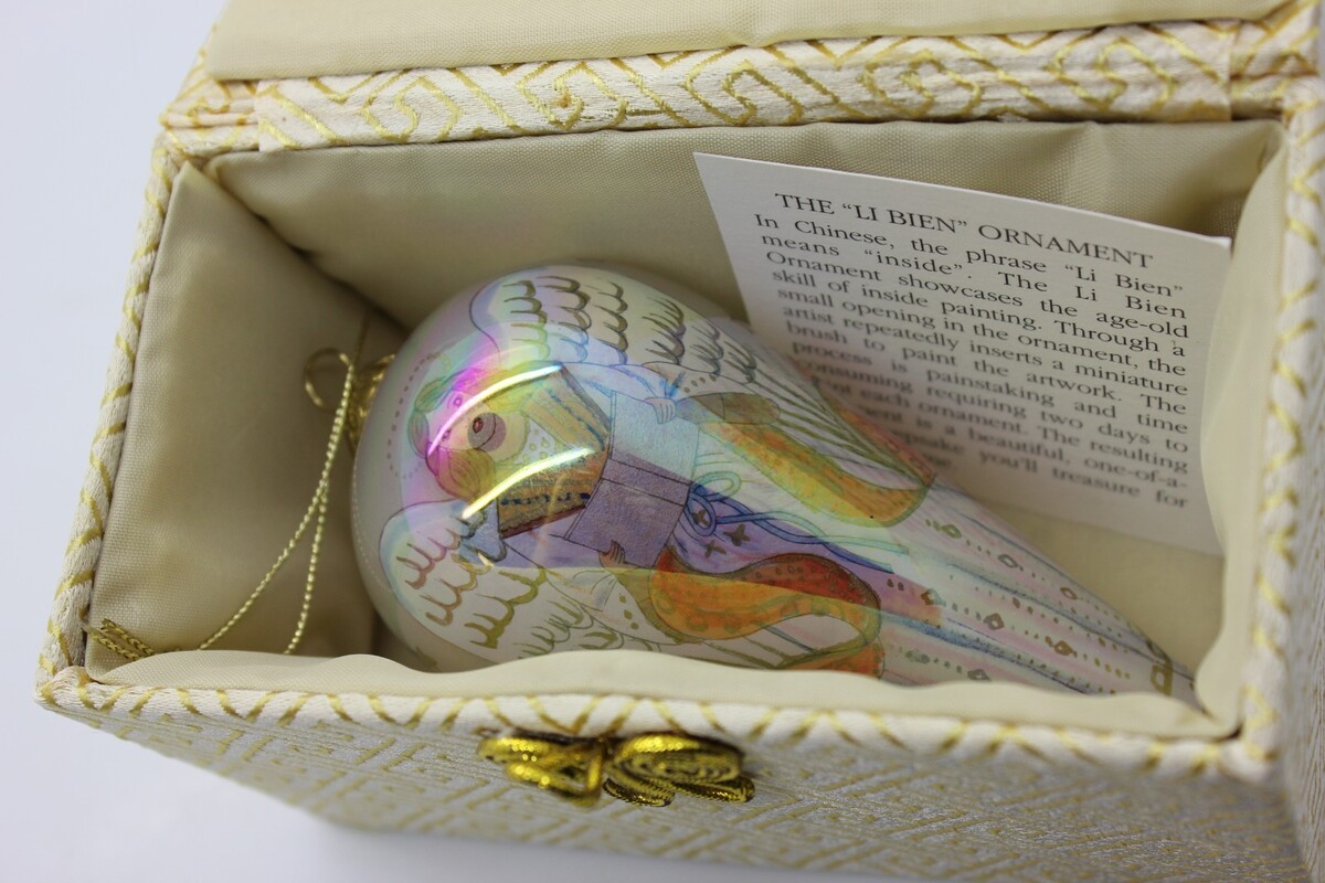 In Chinese, the phrase "Li Bien" means "inside", The Li Bien ornament showcases the age old skill of inside painting, which originated in the Qing Dynasty. It has been a respected Chinese art for over 200 years.