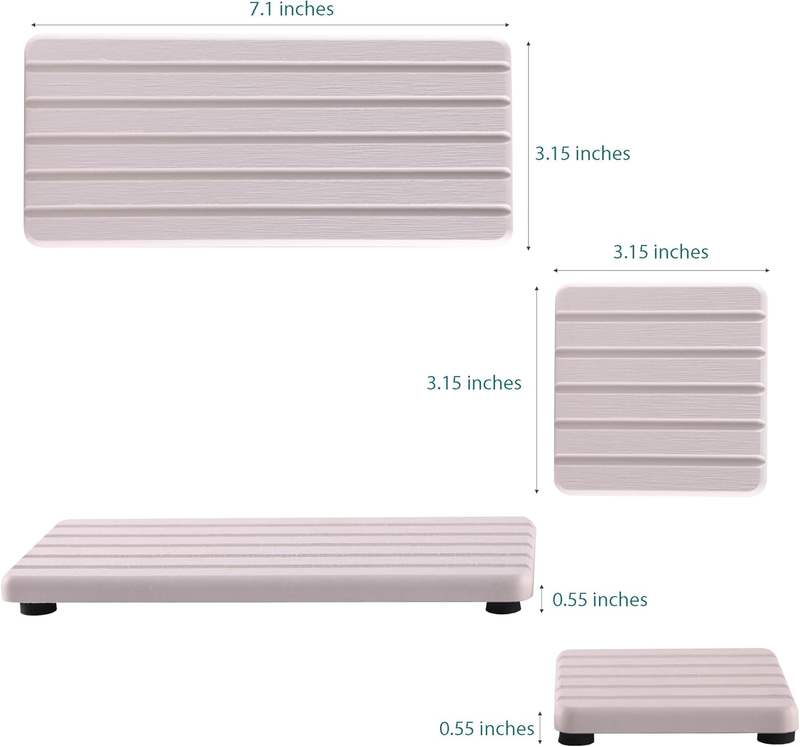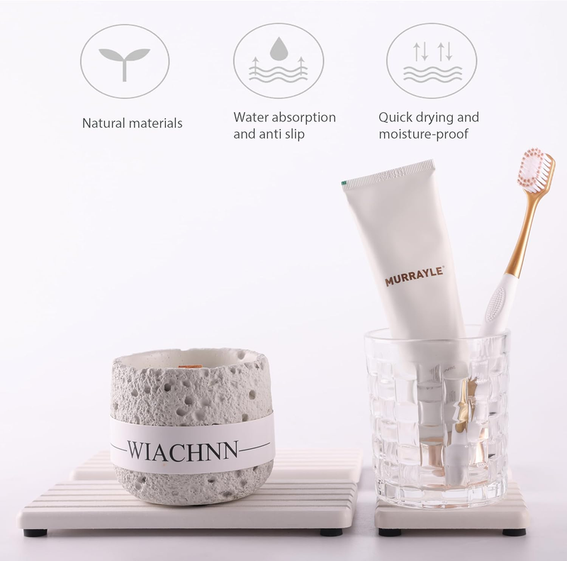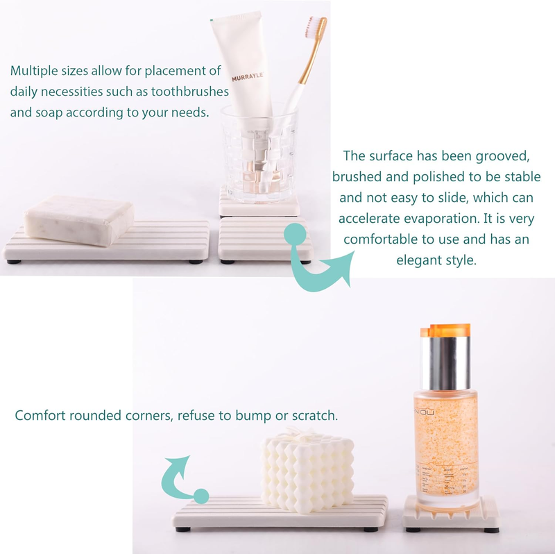 Striped ditch design speeds up the absorption and volatilization of water, and has anti-skid effect.Silicone footpads boost the slip-resistance of coasters while keeping them out of the bathroom vanity. This design improves the contact surface between the diatomaceous earth coaster and the air, prevents moisture, and prolongs the service life of the product.