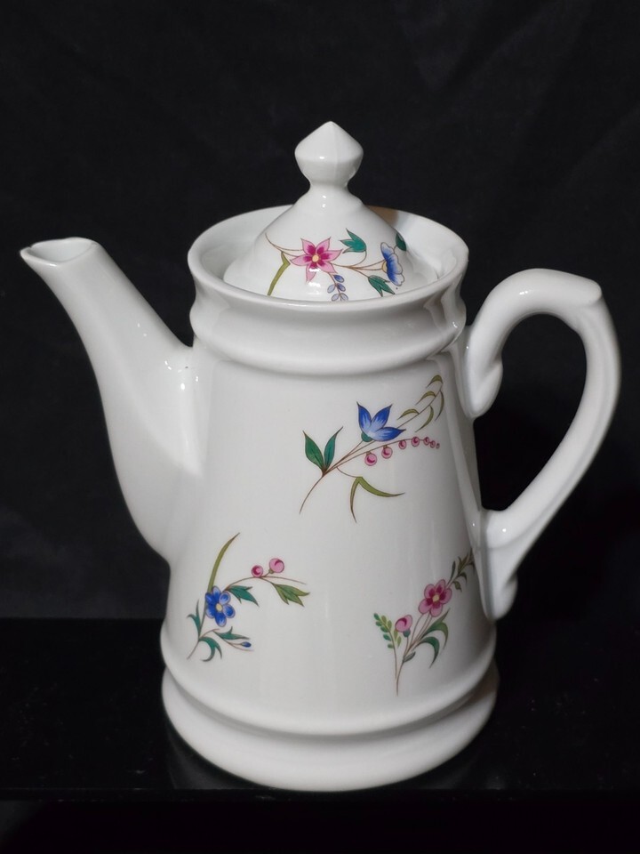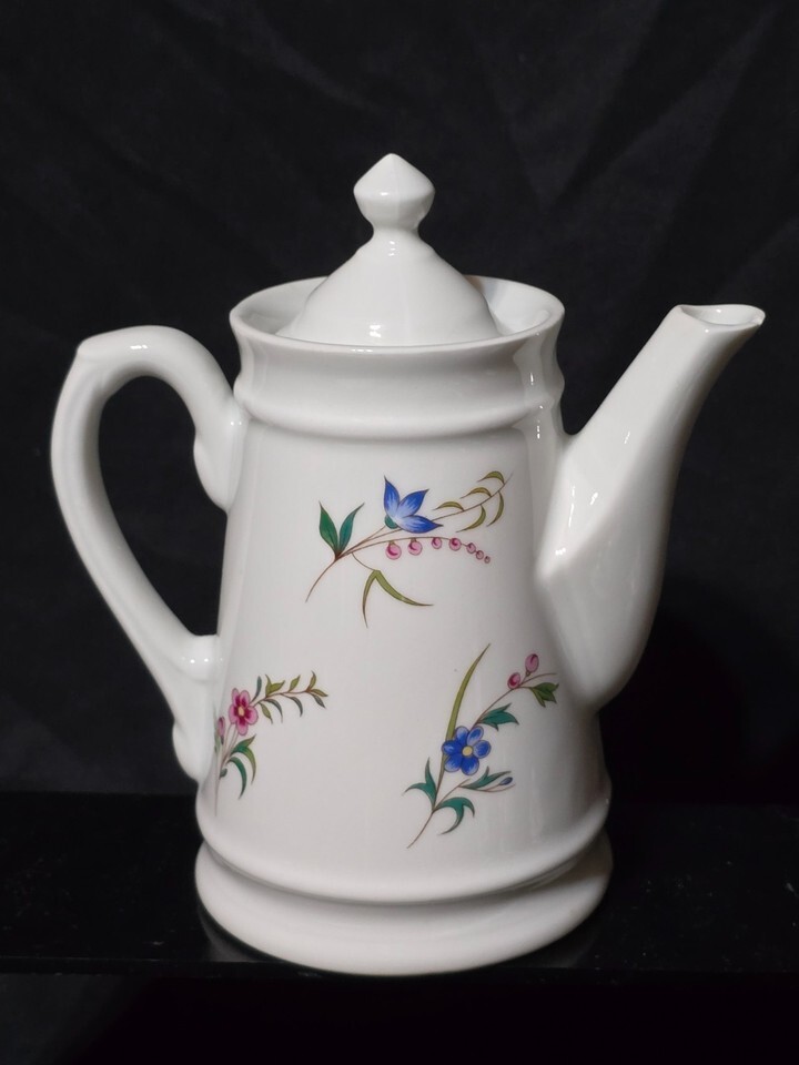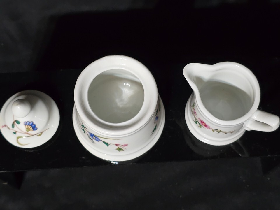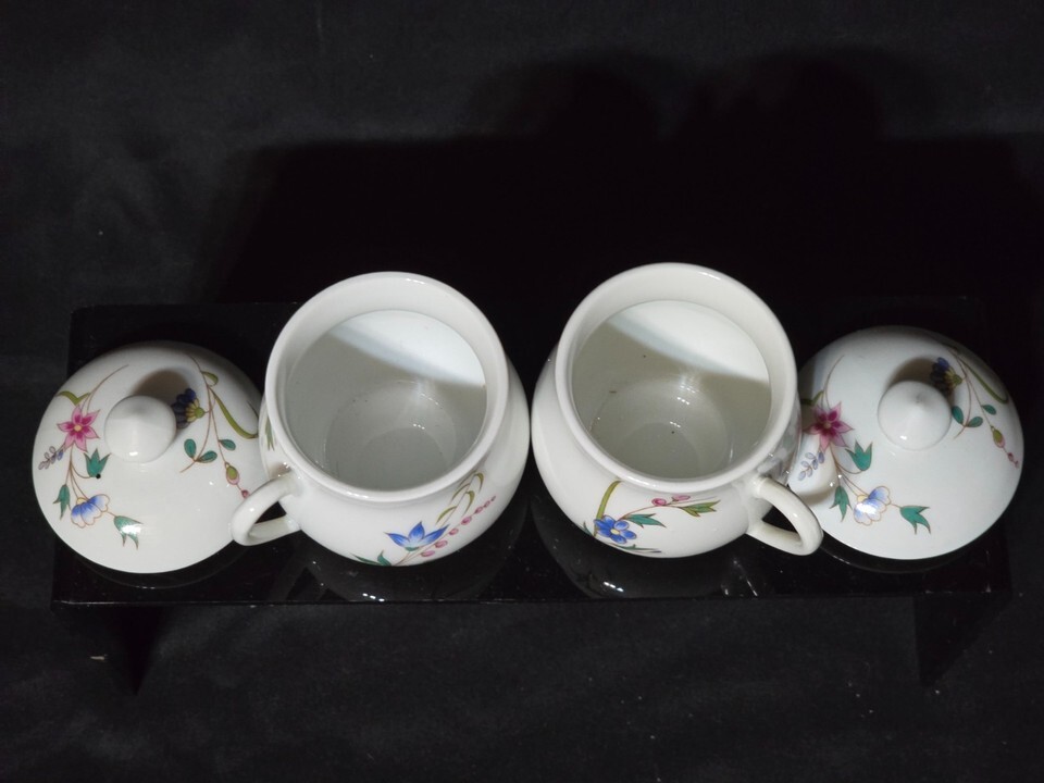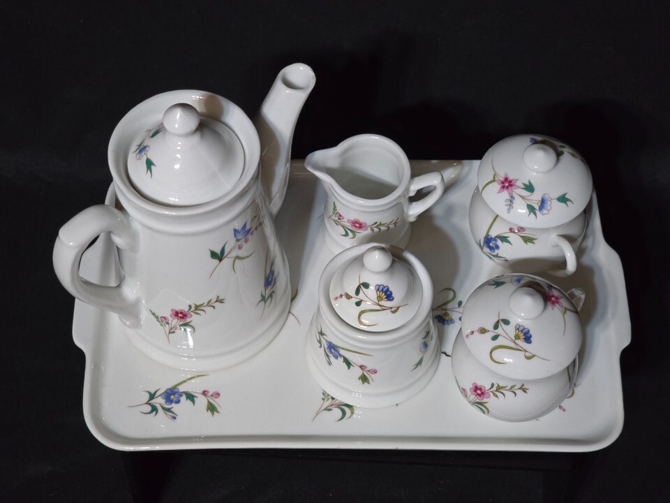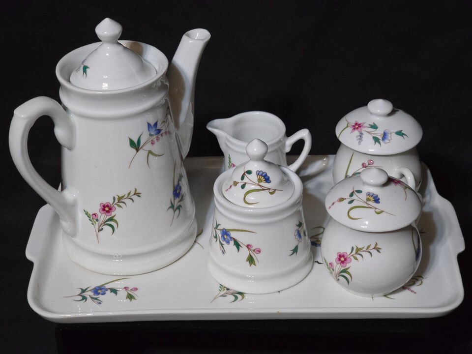 no evidence of damage or wear. Set includes tea pot, creamer, sugar bowl, two condiment jars for jams/jelly/honey, serving tray and lids. Circa late 1980s-early 1990s.