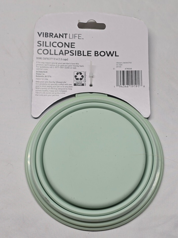 Brand new Vibrant Life silicone collapsible food and water travel bowls. Ideal for small to medium dogs and/or cats, but will work in a pinch for larger dogs as well. Capacity is 1.5 cups (12 ounces).